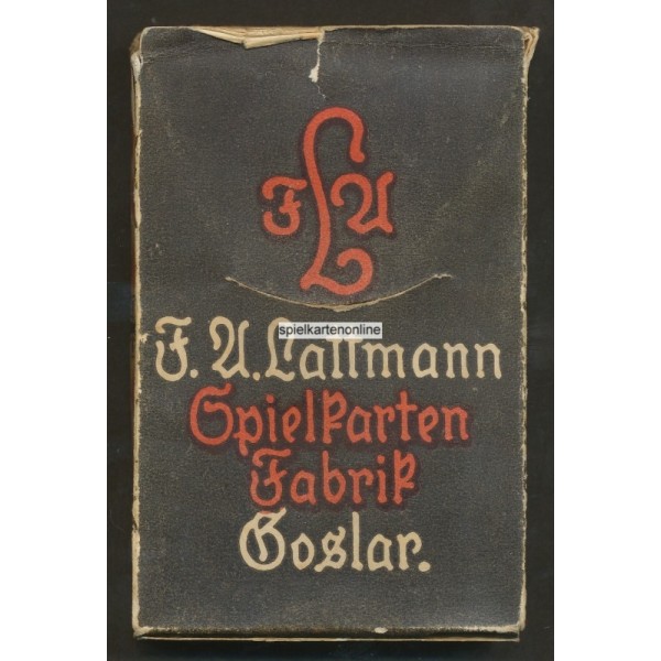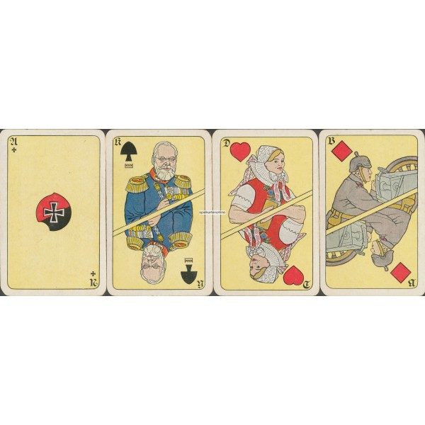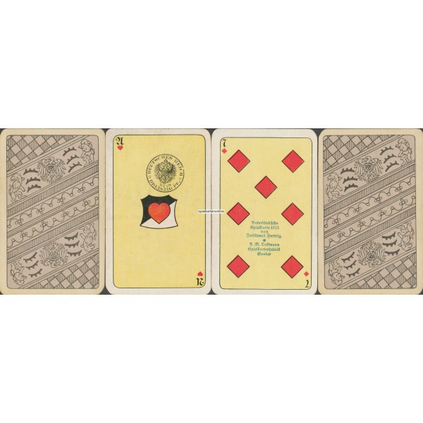 Karten gut erhalten, lediglich Herz As mit einer kaum sichtbaren herstellungsbedingten Quetschfalte / Cards in good condition, only the Ace of Hearts has a manufacturing-related crease