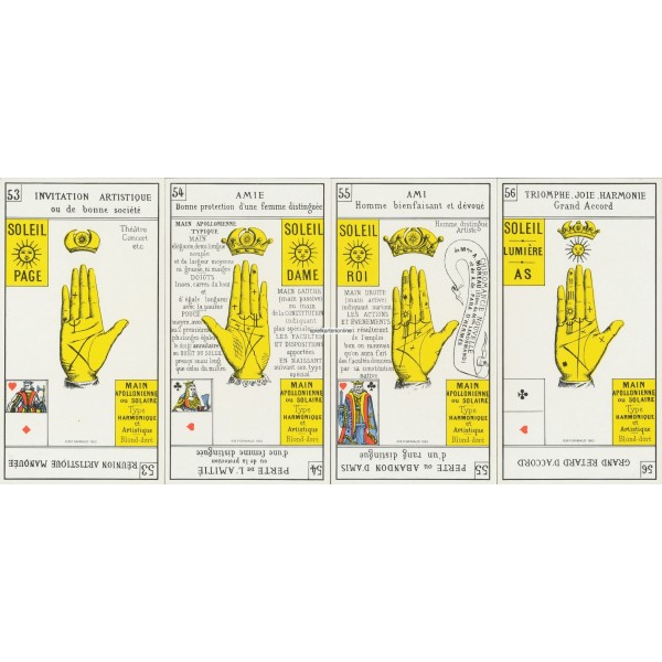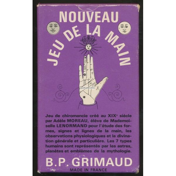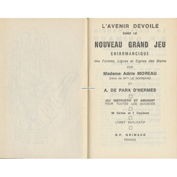 Adèle Moreau said to have been a pupil of Lenormand. It took over the rooms of Lenormand (5 rue de Tournon, Paris). She became famous in the chiromancy (reading the lines of the hand) and the 1869 publication of the book "L'avenir devoile - chiromancie nouvelle" ("The future presents - new palm reading"). She is also the author of the fortune telling game "Jeu de la main", which is still produced.