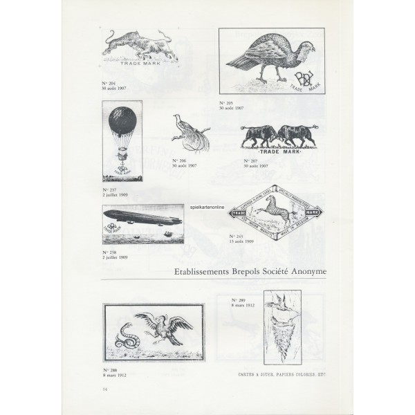 abgebildet sind Firmenzeichen, Rückseiten, einzelne Karten einiger Spiele, Verpackungen, Joker und Pik As von Turnhouter Herstellern, Text teilweise in flämisch,französisch, englisch und deutsch