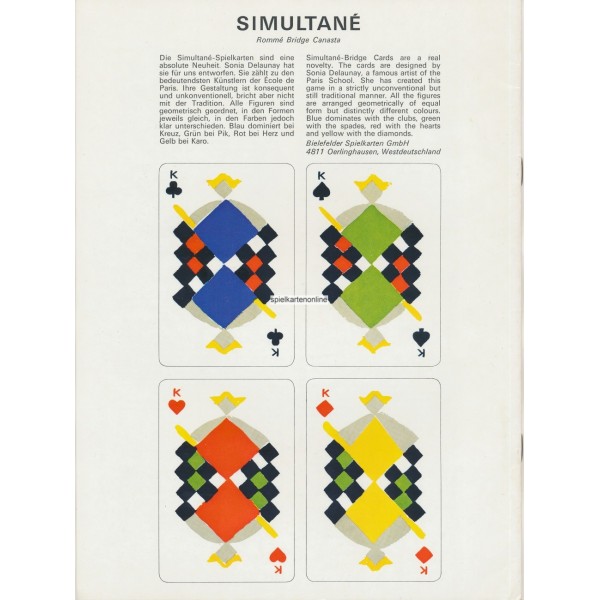 Rückseite mit Werbung für das Spiel "Simultané" entworfen von Sonia Delauney für die Bielefelder Spielkarten